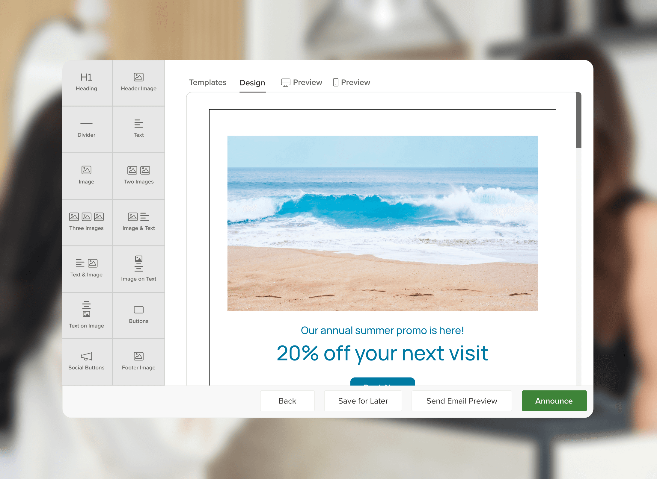 Vagaro's email and text marketing tools allow you to easily reach out to your clients with promotional messages, appointment reminders, and business updates. You can create, schedule, and send campaigns directly from Vagaro.