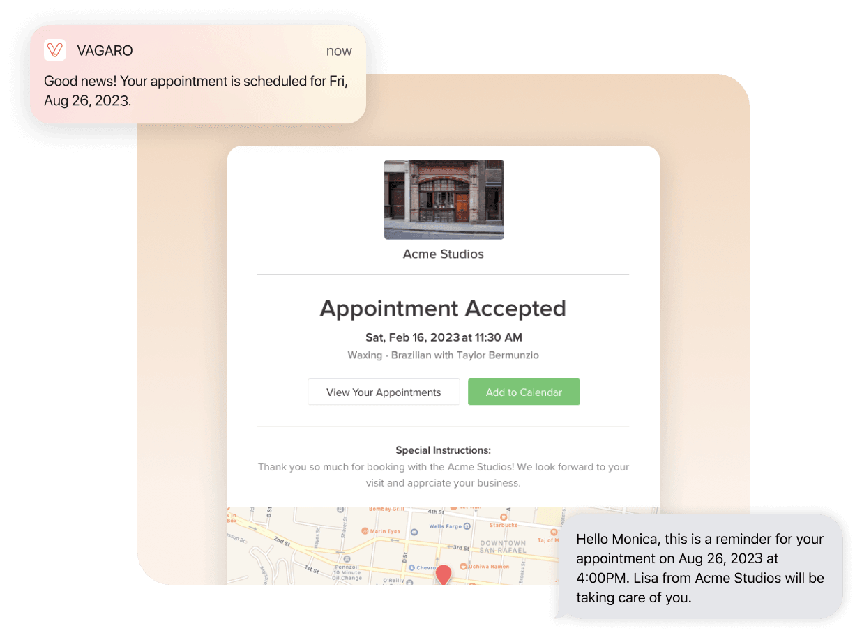 Once your clients install the Vagaro client app, they will instantly be notified about anything relating to their appointments and even your last-minute promotions. Clients will be able to add the appointments to their phone calendar in seconds.
